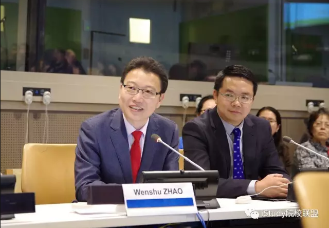 南京大学国际教育学院院长赵文书教授(左一)、程爱民教授(右二)、联合国中文组组长何勇博士(左二)、iStudy双日教育 CEO饶莎女士(右一)